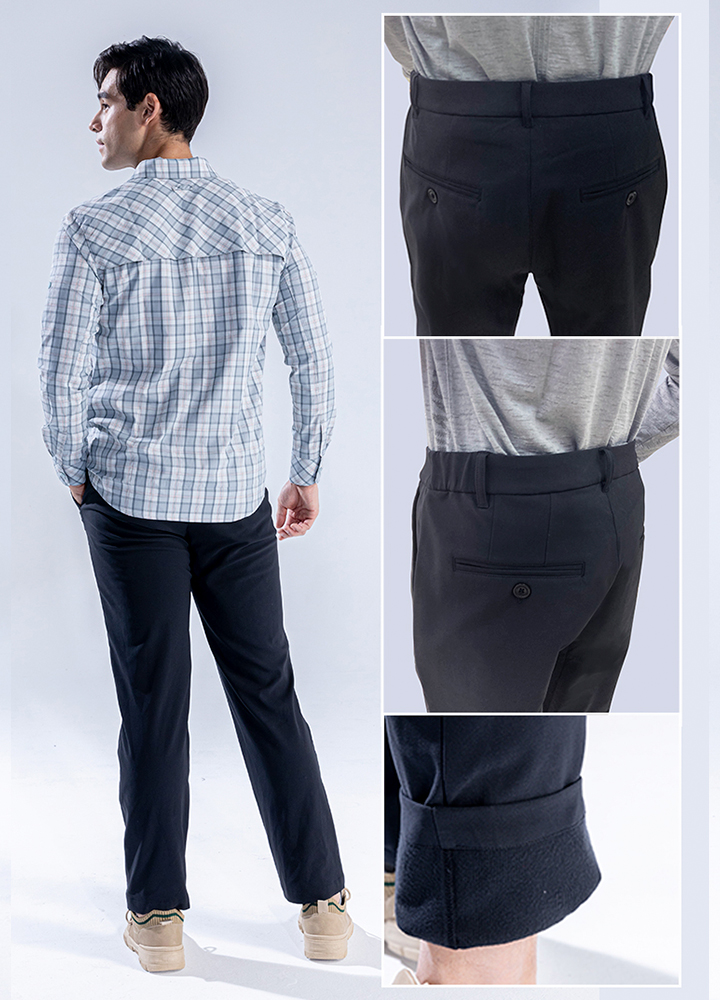 (water-repellent, brushed for warmth, not stuffy, easy to remove stains, elastic, suit pants cut)